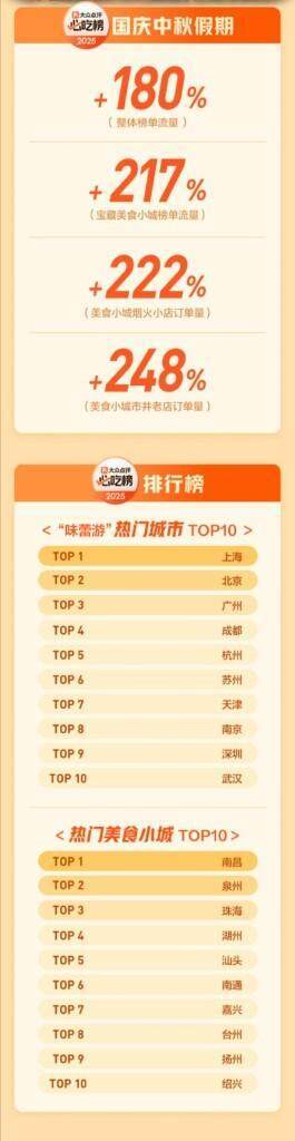 上述这样的场景,在国庆假期不止发生在一家店——10月9日大众点评发布的黄金周寻味数据显示,汕头跻身全国热门美食小城TOP10,当地上榜小店的订单量同比涨超222%,异地游客通过外卖下单送到酒店的比例也大幅提升。“必吃榜”带动效应明显,不少小店都迎来了“爆发式”增长。