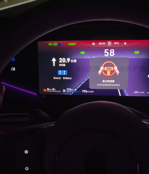 从仪表盘可以看到,当时这辆尊界S800电池电量已经被耗尽,油箱里显示的是满油,且有个“闪电”符号(注:该符号意味着增程器正在给电池补能),系统不停提醒“请立即接管”,还显示“ESP未就绪,请锁车后再试”。