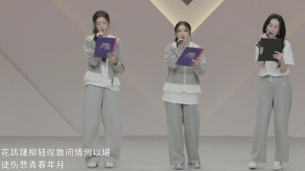 每个人都拿着文件夹看歌词,有点像我在学校做小组汇报,连技巧都差不多,先低头看看稿,再抬头和评委老师以及观众视线交流一下。下面的观众也完全是开会汇报时众生百态,溜号的、交头接耳的,努力打 call 的,昏昏欲睡的。