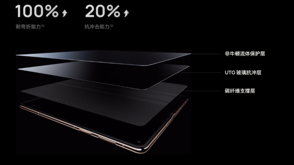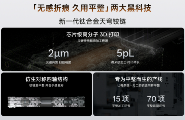 它能这么“抗造”,关键在于内部搭载了新一代钛合金天穹铰链,通过芯片级的高分子3D打印技术打造,让铰链表面平整度大幅提升,再配合具备主动回弹能力的天穹记忆玻璃,其抗弯曲形变能力提升了338%,屏幕展开后,轻微的折痕甚至会在1-2小时内自行淡化消失。