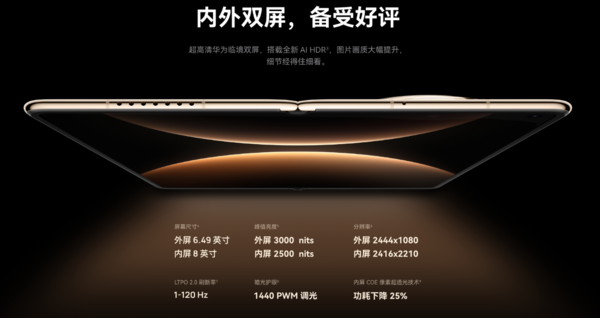 在用户关注的屏幕体验上,华为Mate X7内外双屏均搭载了临境显示技术,实现了视觉体验的统一与跃升。其6.49英寸外屏与8英寸内屏都支持1-120Hz LTPO自适应刷新率,外屏峰值亮度高达3000nits,内屏也达到了2500nits。这意味着无论是在烈日直射下查看信息,还是在暗光环境中阅读,屏幕都能呈现清晰、流畅且舒适的细节,让大屏体验在开合之间无缝衔接。