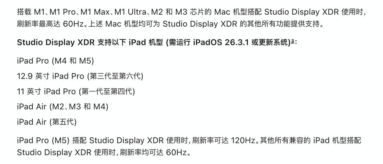 根据苹果的介绍,搭载 M1 全系、M2 或 M3 芯片的 Mac 机型,在搭配新款 Studio Display XDR 使用时,刷新率最高只有 60Hz。