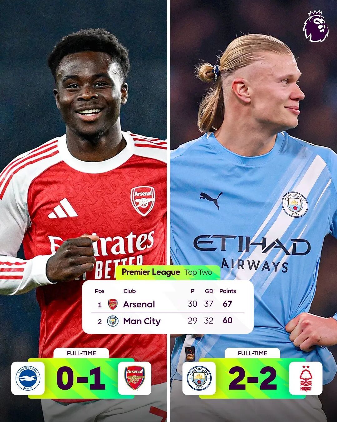 又是一个波谲云诡的周中,英超赛场热闹非凡。争冠集团的阿森纳和曼城同时亮相,结果枪手有惊无险地以1比0击败布莱顿,曼城则意外地在主场被诺丁汉森林2比2逼平。作为足坛流量之王,此前高歌猛进的曼联也遭遇滑铁卢,在圣詹姆斯公园球场惨遭纽卡绝杀,11轮不败就此戛然而止。