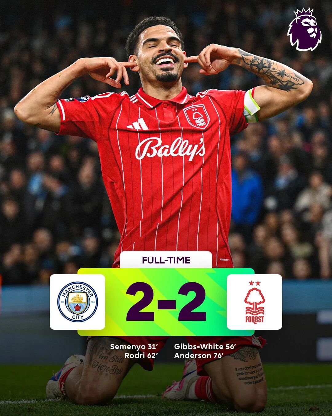 当然,志在争冠的曼城不会轻易让三分溜走,第62分钟,罗德里的头槌破门就让蓝月亮再次取得领先,只可惜一记世界波搅了局——第77分钟,安德森用惊世骇俗的远射为森林再次扳平比分。比赛尾声阶段,不甘平局的曼城发起疯狂的进攻,然而罗德里禁区内的倒地裁判没有判罚,独秒阶段最后的机会还被穆里略门线解围。