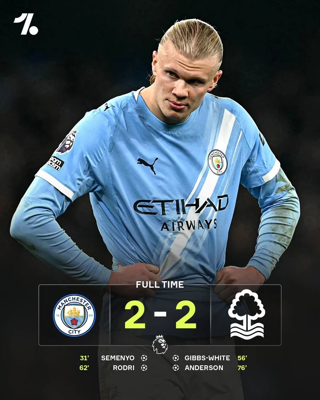 将目光移向曼彻斯特,就完全是另一番景象了。坐镇伊蒂哈德球场的曼城,面对森林很快就占据了上风,塞门约、B席、福登们连番发难,最终由谢尔基助攻塞门约在第31分钟凌空端射首开纪录。但森林是顽强的,虽然长期被压制,但只要遇到机会就能一锤定音,第57分钟,吉布斯-怀特就用精妙的脚后跟破门让双方回到同一起跑线。