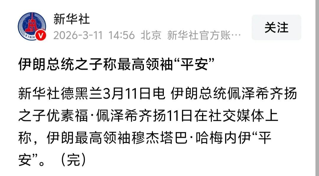 有外媒说,伊朗刚选出新任最高领袖穆杰塔巴,遇袭受伤了。开始我是不信的,然而刚刚看到新华社发了一条内容说:伊朗总统之子称最高领袖“平安”(如图),那被袭受伤的消息大概率是真的了。